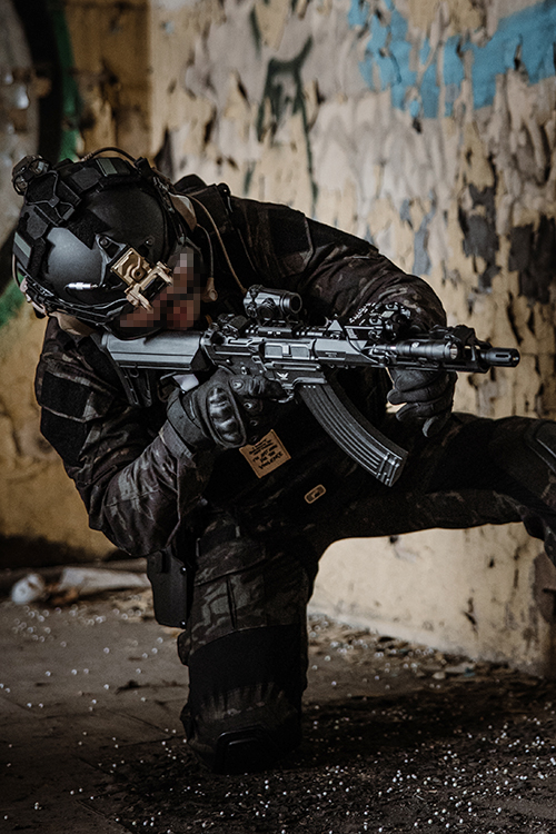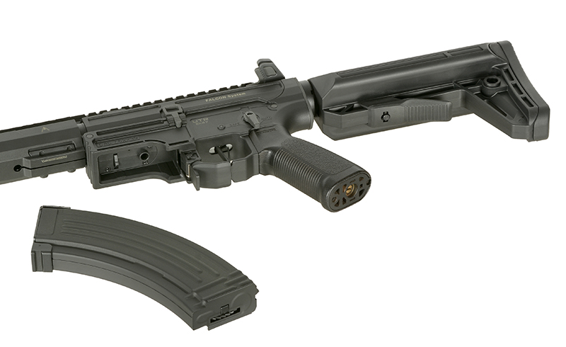 The folding stock includes ambidextrous QD sling points. The rear cap allows easy access to the battery compartment. The replica uses an AK-style magazine well with a special lever preventing BB spillage during reloading.