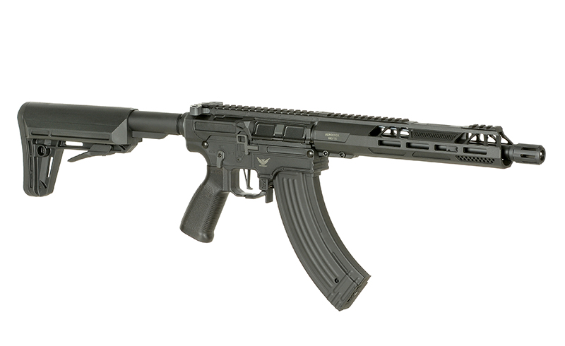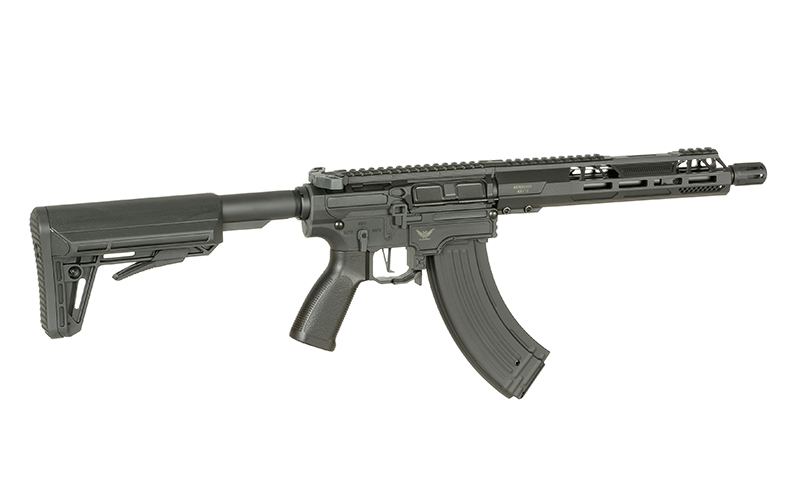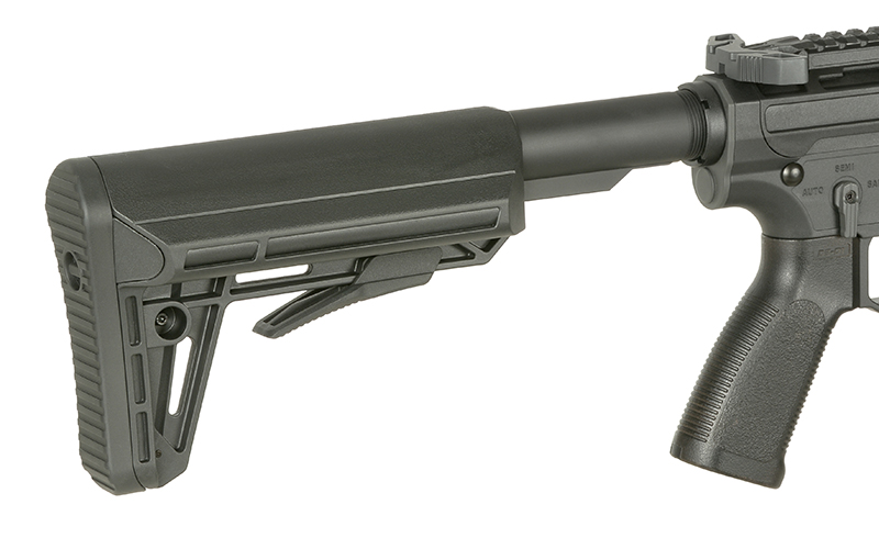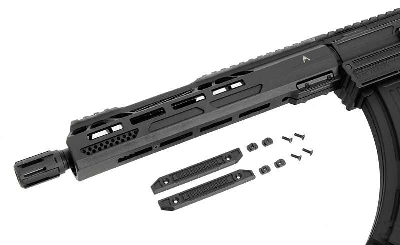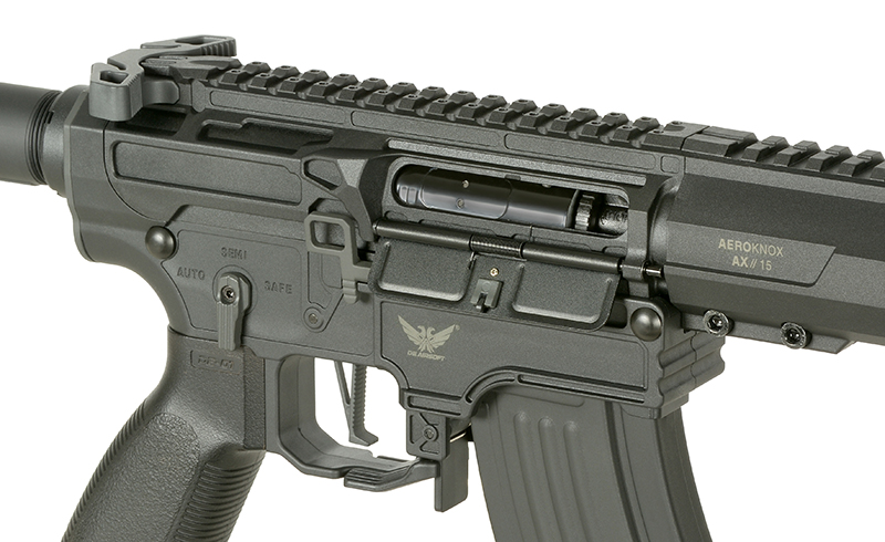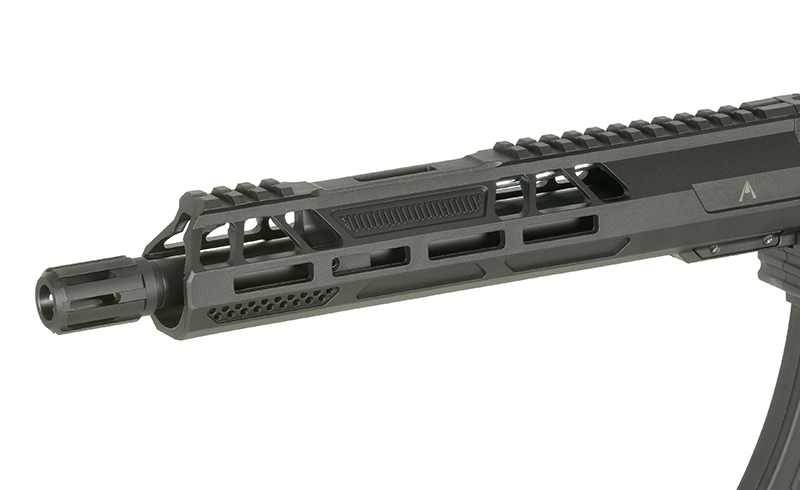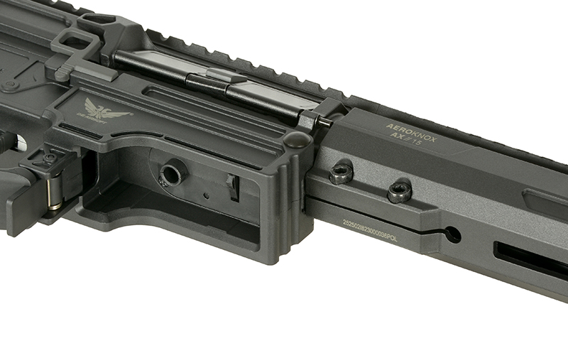 The replica is made of reinforced polymer, combined with metal elements (outer barrel, flash hider, stock tube), ensuring durability and low weight. A key feature is the licensed Aeroknox 10.5" handguard, equipped with 22 mm Picatinny rail segments and M-LOK slots for accessory mounting.A unique serial number is located beneath the handguard. The top 22 mm rail allows mounting various optics, and all controls — magazine release, bolt catch, fire selector and charging handle — are ambidextrous, significantly improving ergonomics.