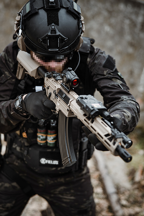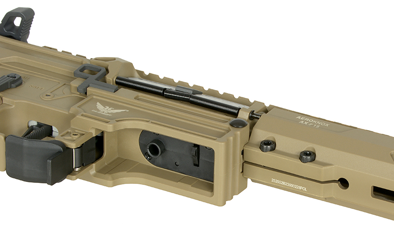 The replica is made of reinforced polymer, combined with metal elements (outer barrel, flash hider, stock tube), ensuring durability and low weight. A key feature is the licensed Aeroknox 10.5" handguard, equipped with 22 mm Picatinny rail segments and M-LOK slots for accessory mounting.A unique serial number is located beneath the handguard. The top 22 mm rail allows mounting various optics, and all controls — magazine release, bolt catch, fire selector and charging handle — are ambidextrous, significantly improving ergonomics.