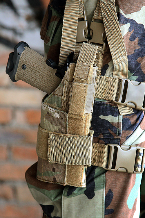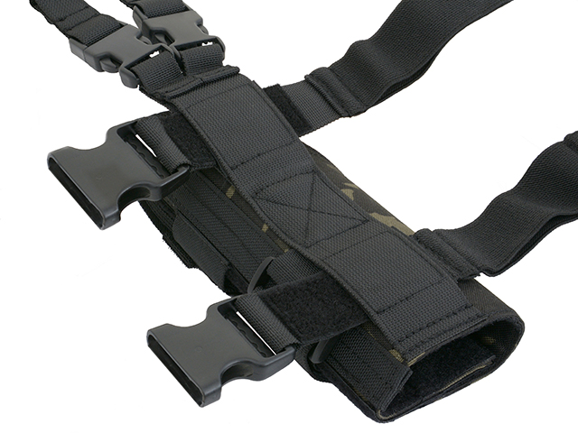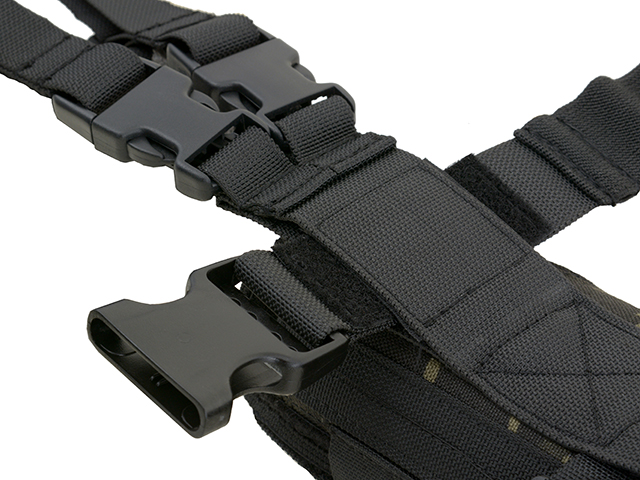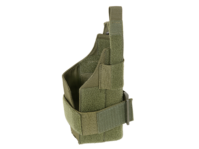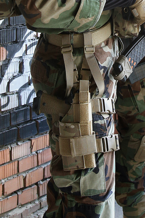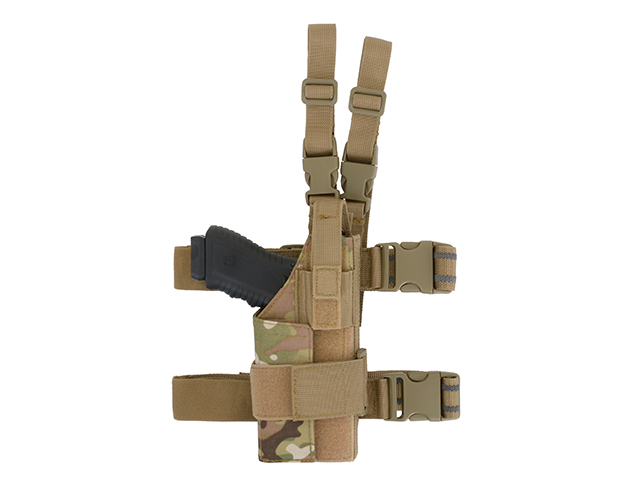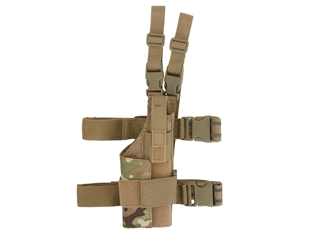 W pełni regulowana. Pasuje do wszystkich pistoletów nawet z oświetleniem taktycznym. W pełni regulowane paski na nogi z gumowymi pasemkami które redukują przesuwanie się kabury i klamry szybkiego wypinania.